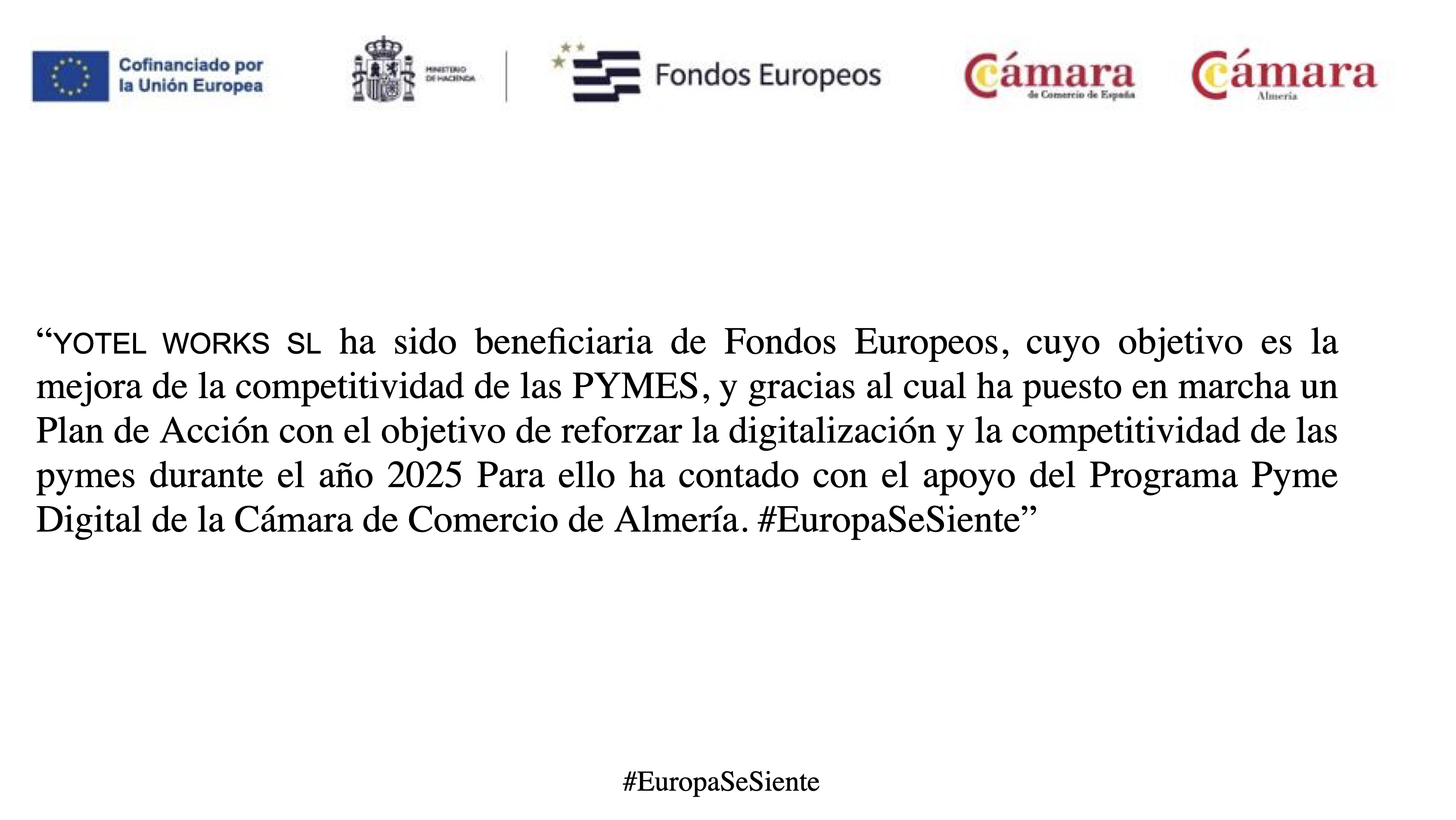«YOTEL WORKS S.L.U. ha recibido una ayuda de la Unión Europea con cargo al Fondo NextGenerationEU, en el marco del Plan de Recuperación, Trasformación y Resiliencia, para la instalación de punto de carga de vehículo eléctrico dentro del Programa de incentivos a la movilidad eficiente y sostenible (Programa MOVES III ANDALUCÍA) del Ministerio para la Transición Ecológica y el Reto Demográfico, gestionado por la Junta de Andalucía, a través de la Agencia Andaluza de la Energía.”